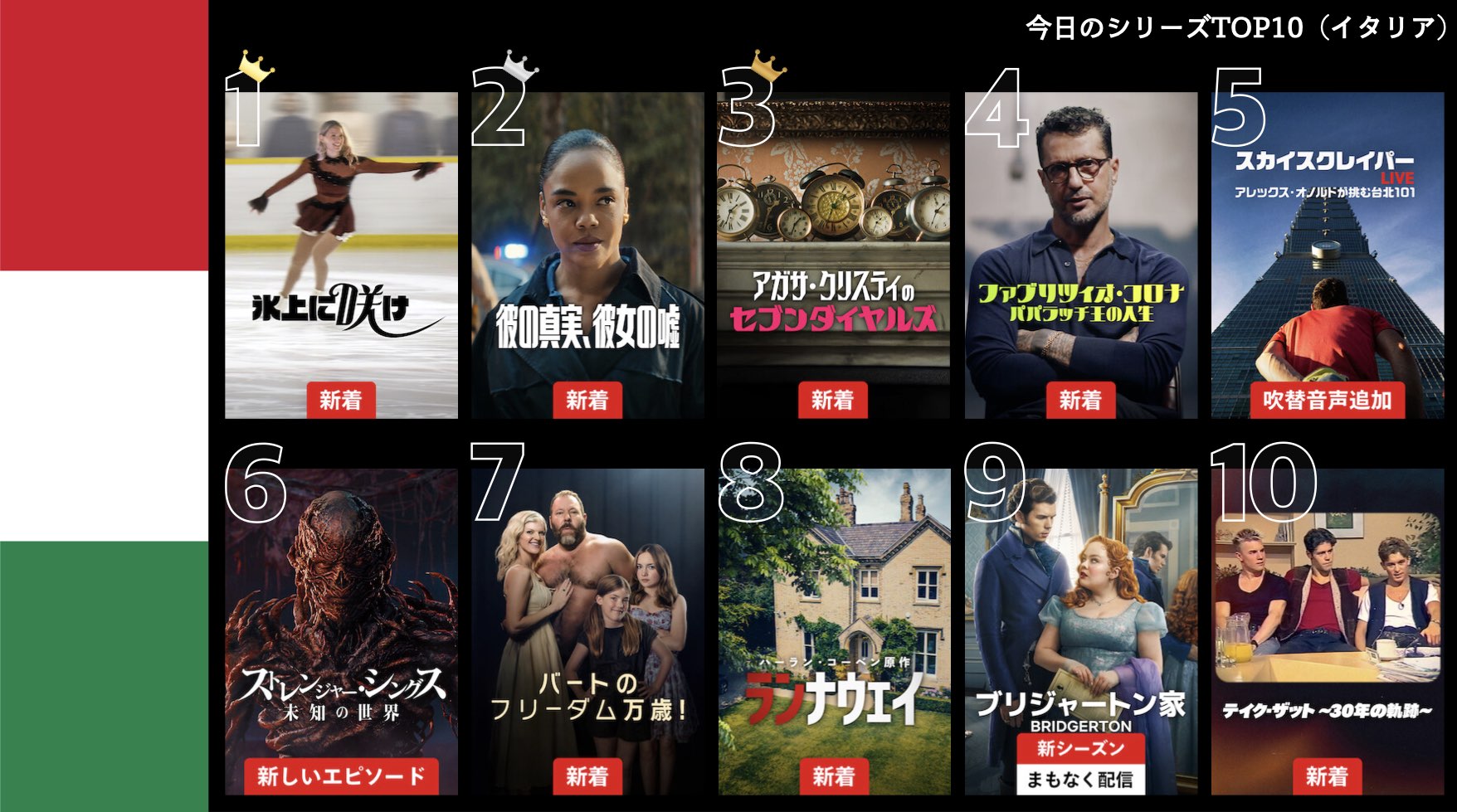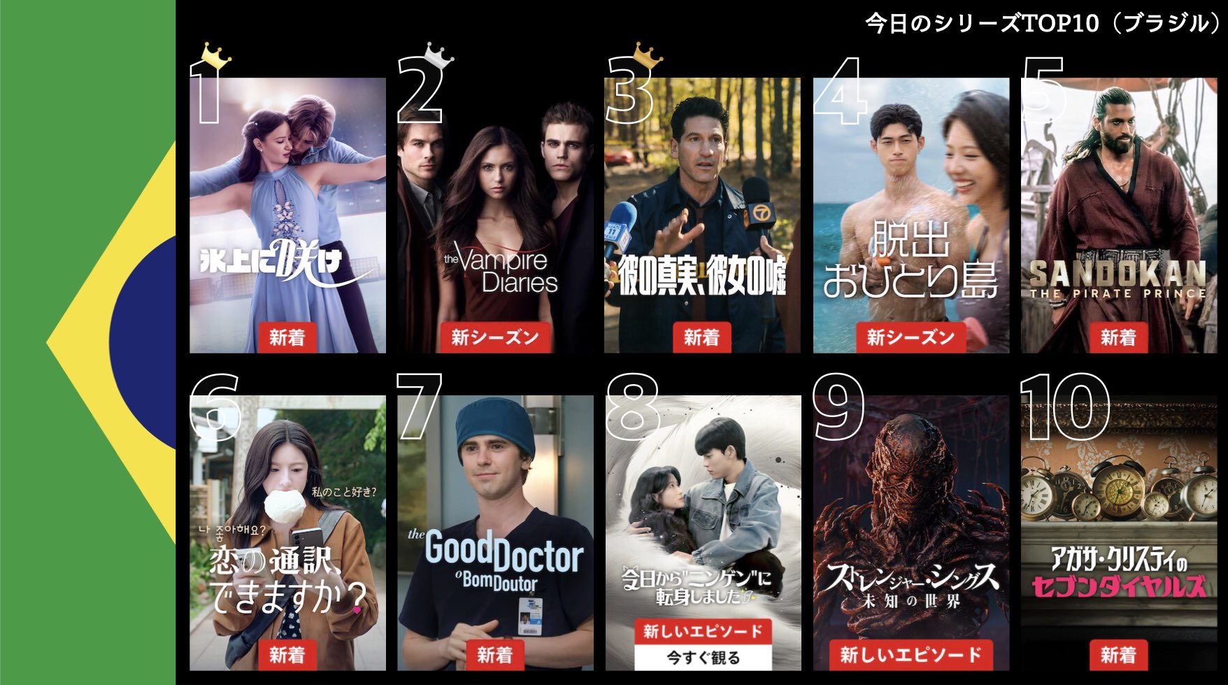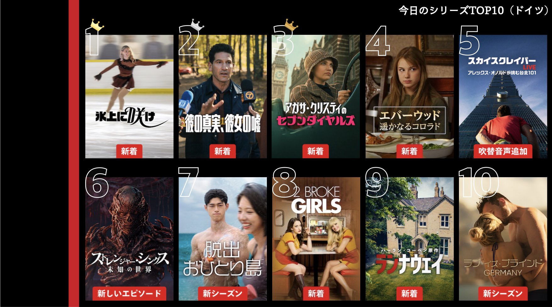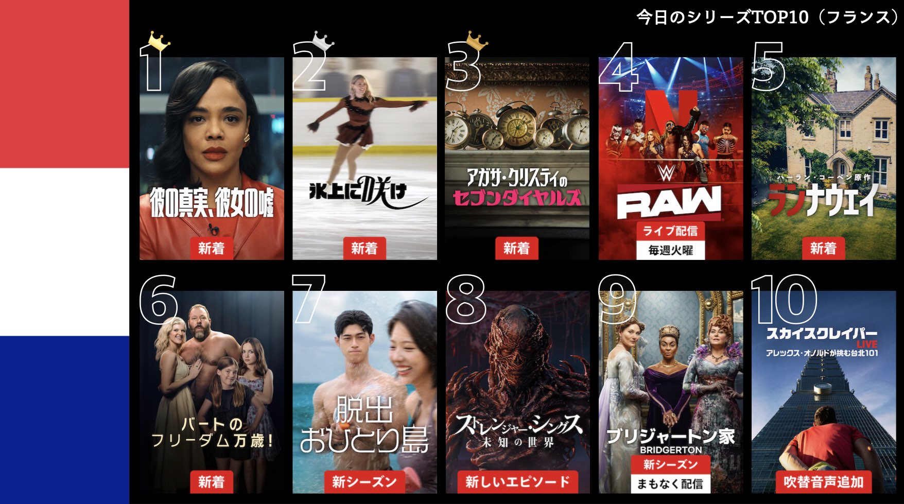 各国のNetflix (ネットフリックス) 内で公開されている「今日のTVシリーズTOP10」と「今日の映画TOP10」をもとに、世界の視聴動向を独自にまとめたランキングを毎日更新!主要国でいま、どんな作品が注目されているかチェックしてみましょう。
