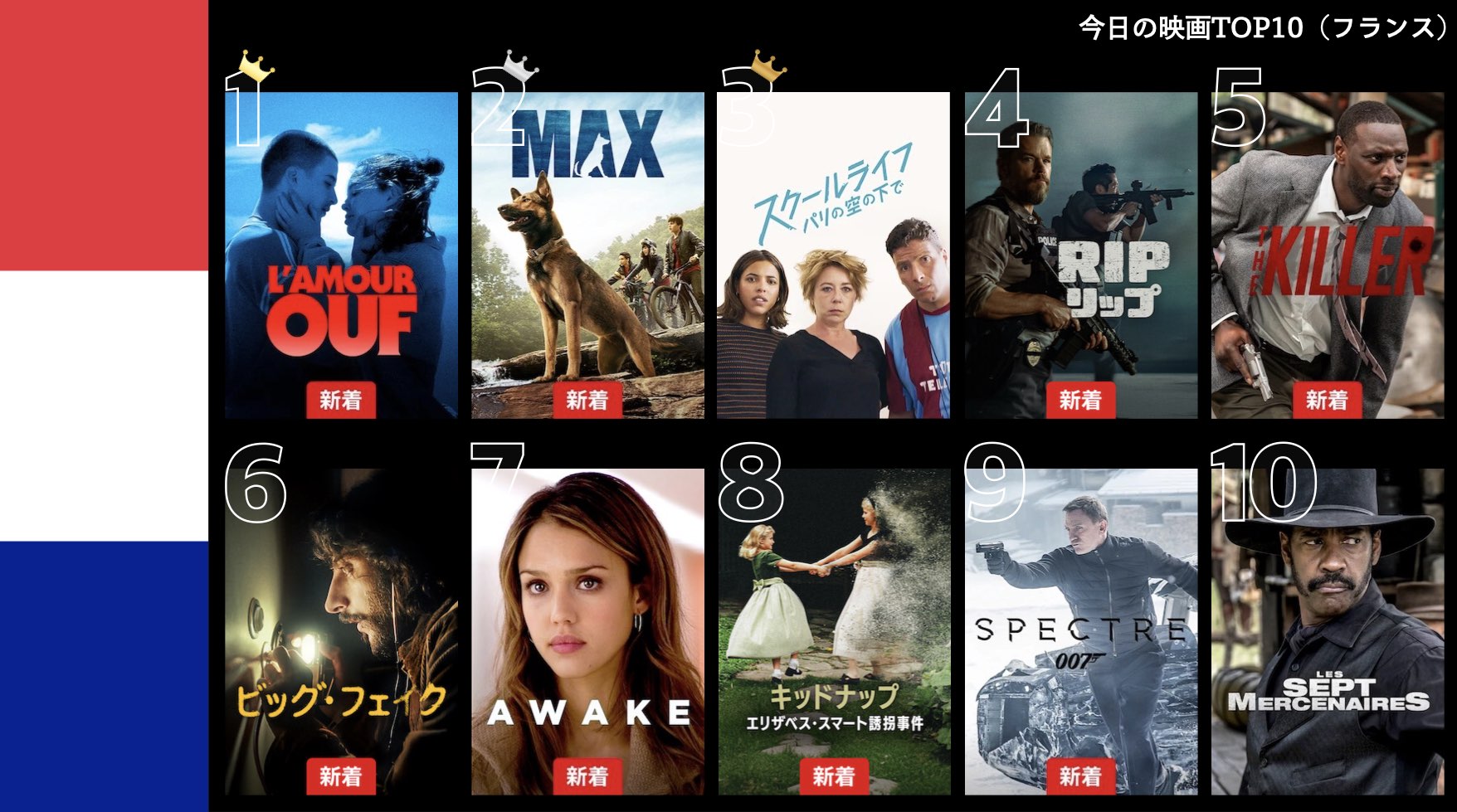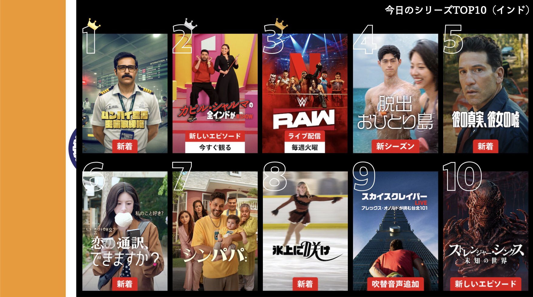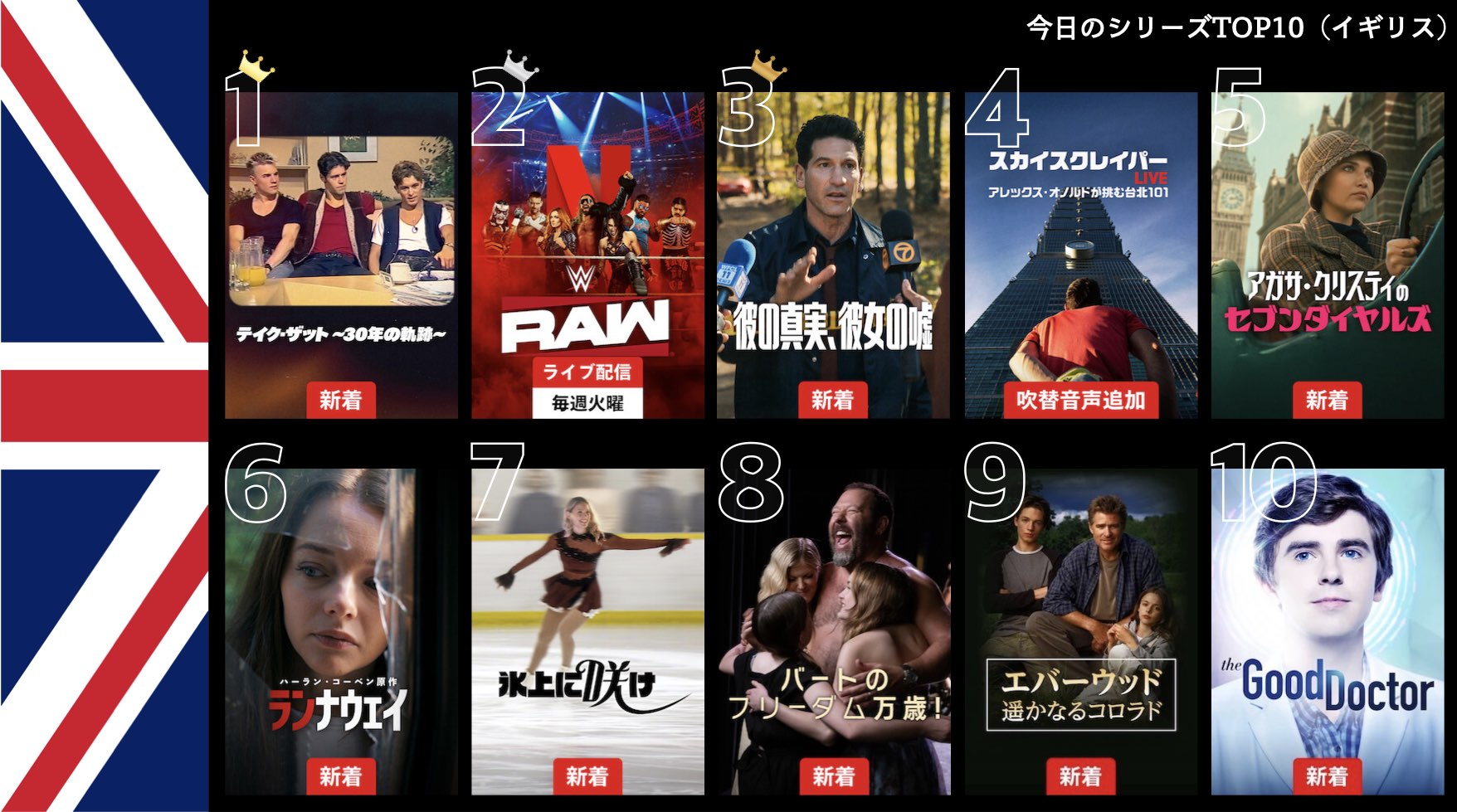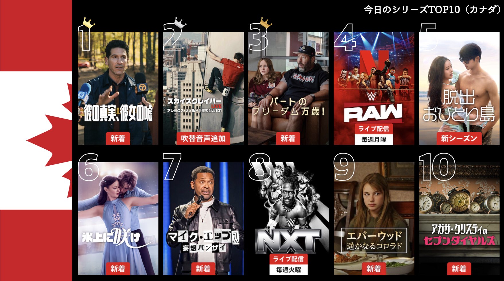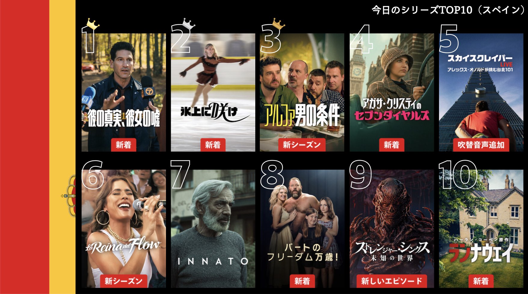 各国のNetflix (ネットフリックス) 内で公開されている「今日のTVシリーズTOP10」と「今日の映画TOP10」をもとに、世界の視聴動向を独自にまとめたランキングを毎日更新!主要国でいま、どんな作品が注目されているかチェックしてみましょう。