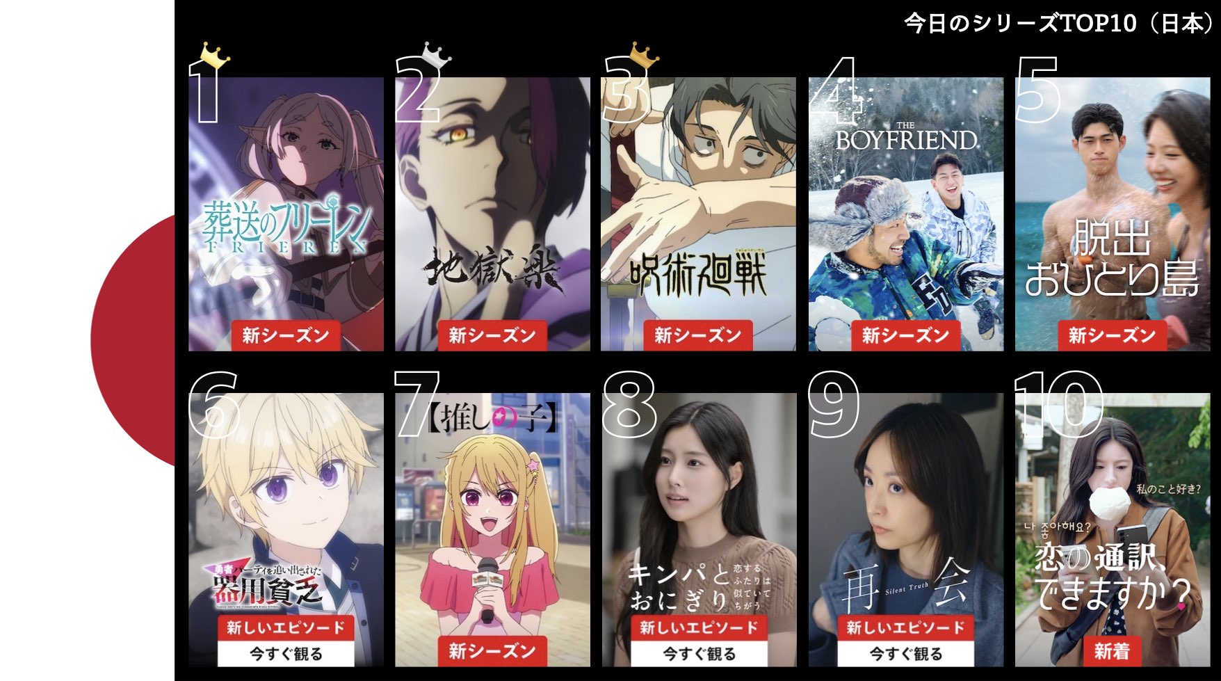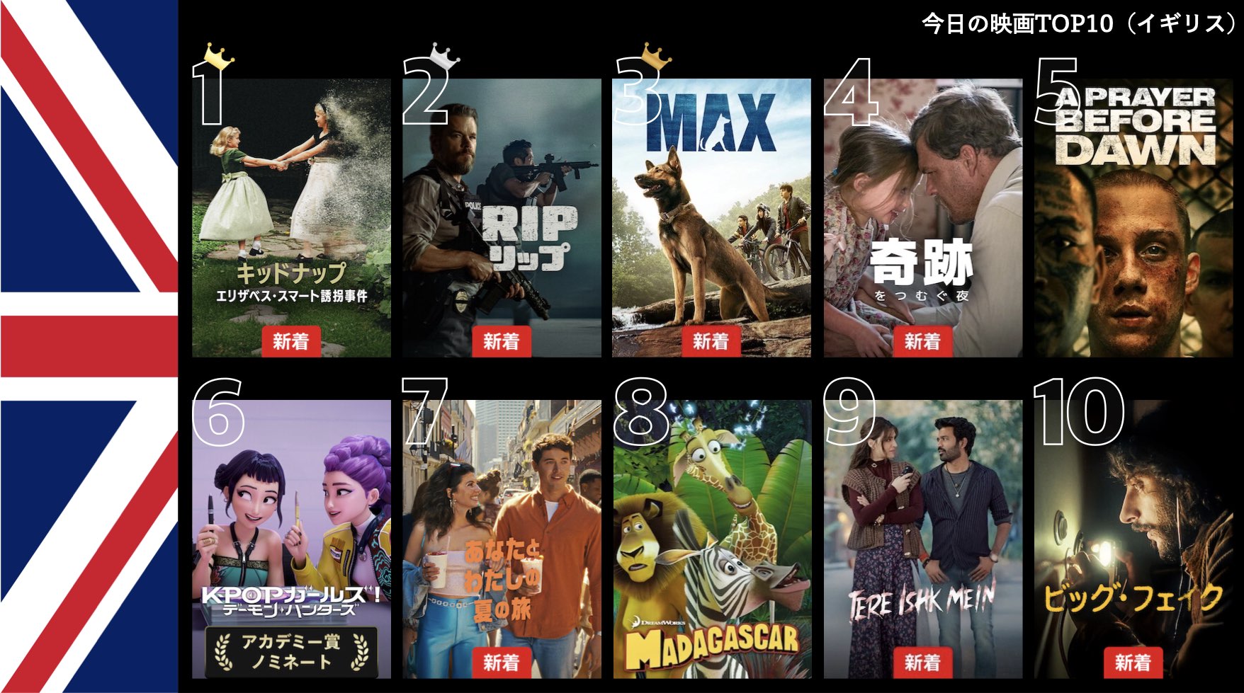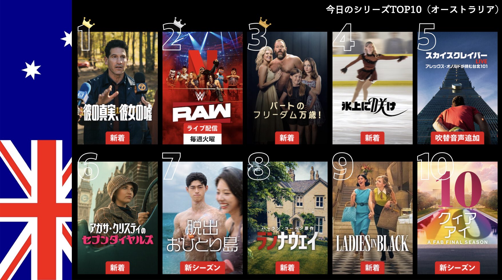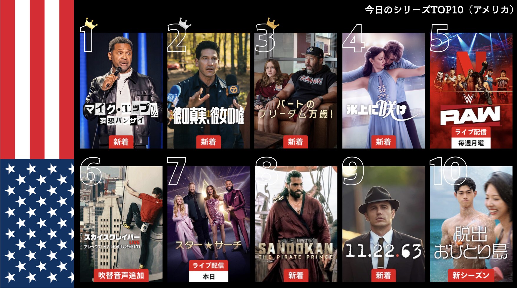 各国のNetflix (ネットフリックス) 内で公開されている「今日のTVシリーズTOP10」と「今日の映画TOP10」をもとに、世界の視聴動向を独自にまとめたランキングを毎日更新!主要国でいま、どんな作品が注目されているかチェックしてみましょう。