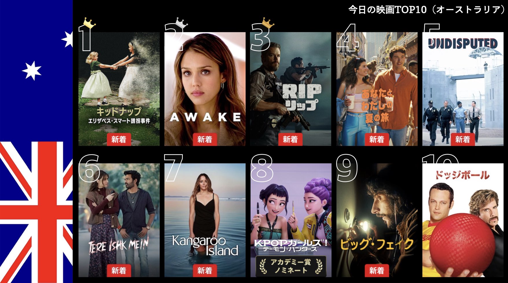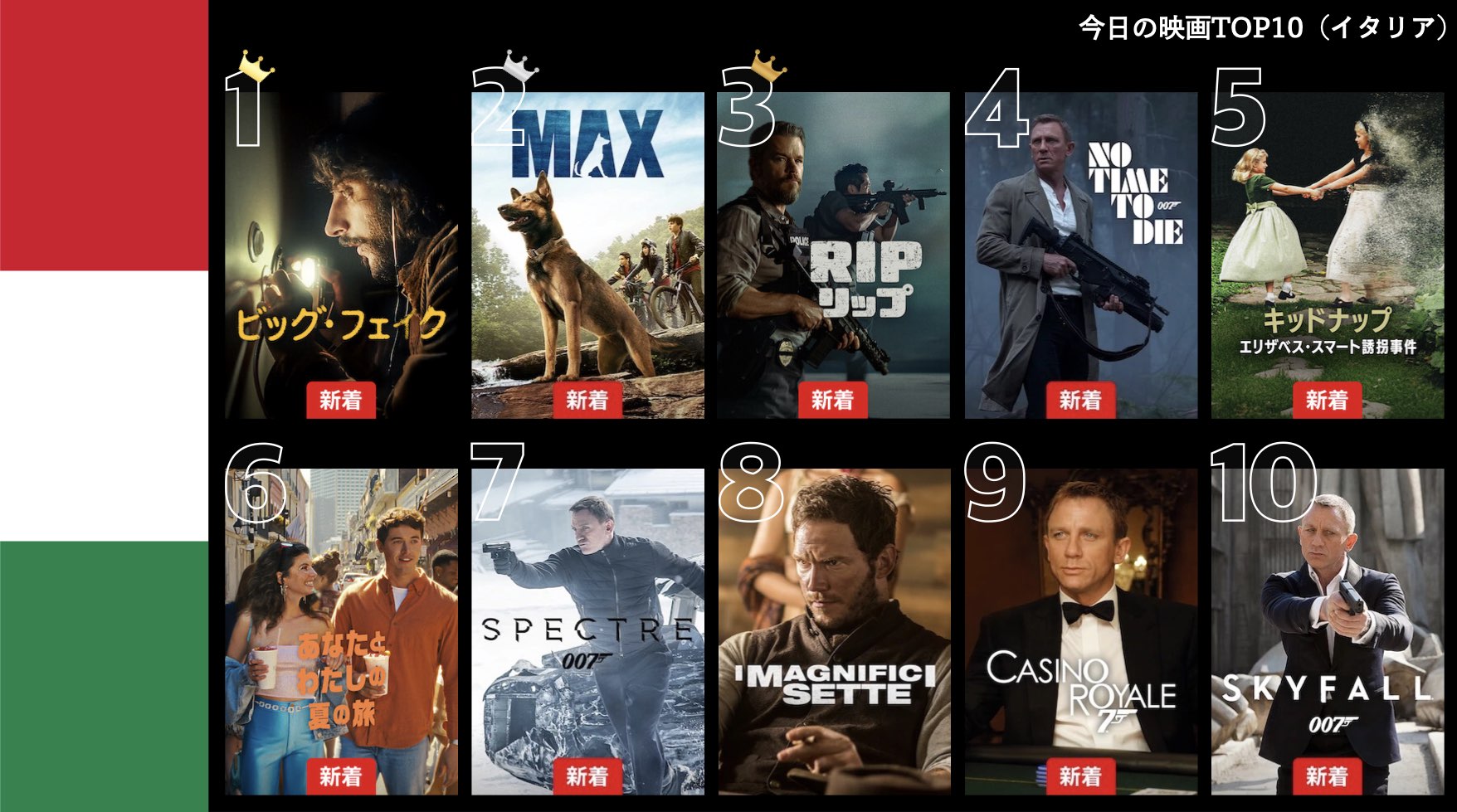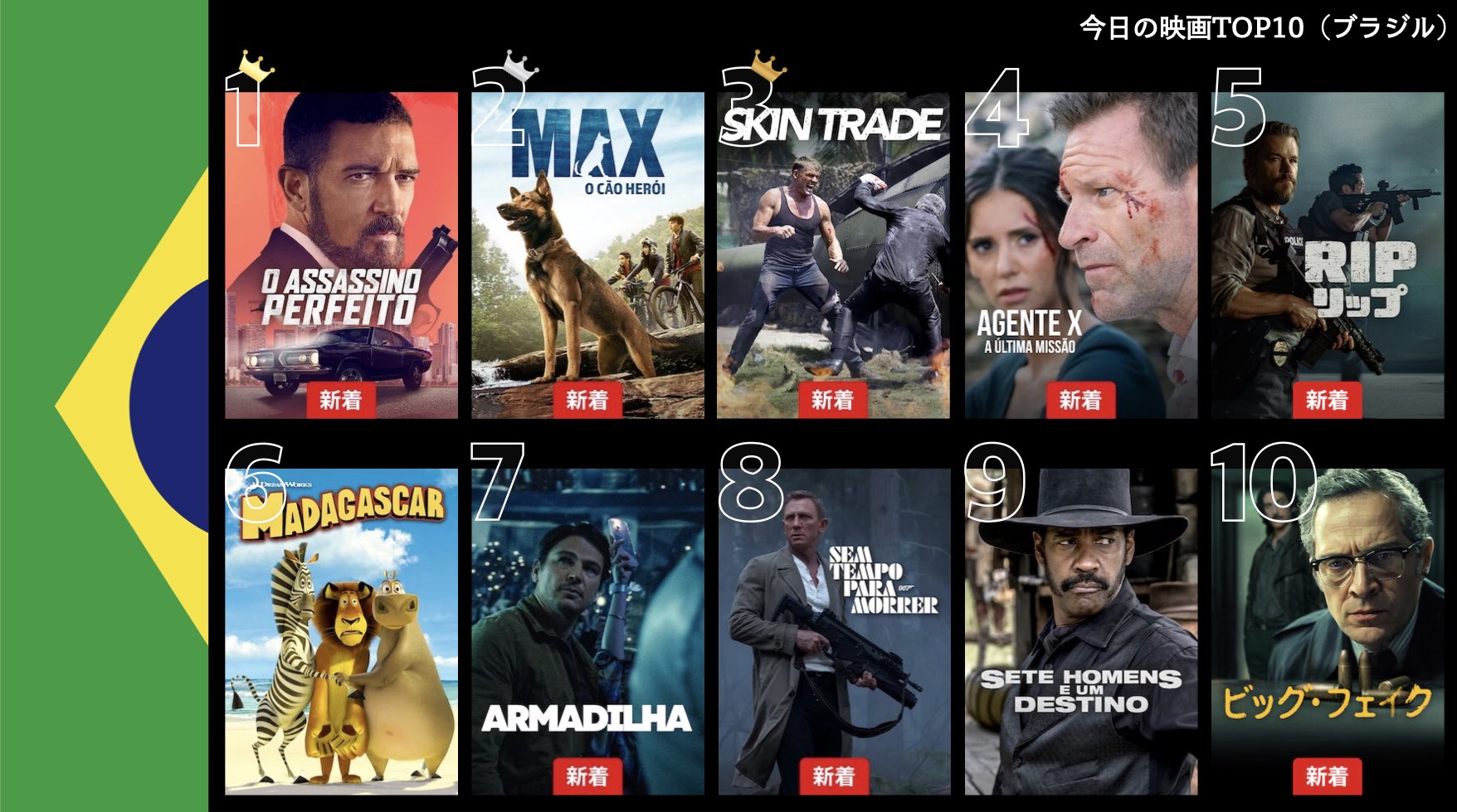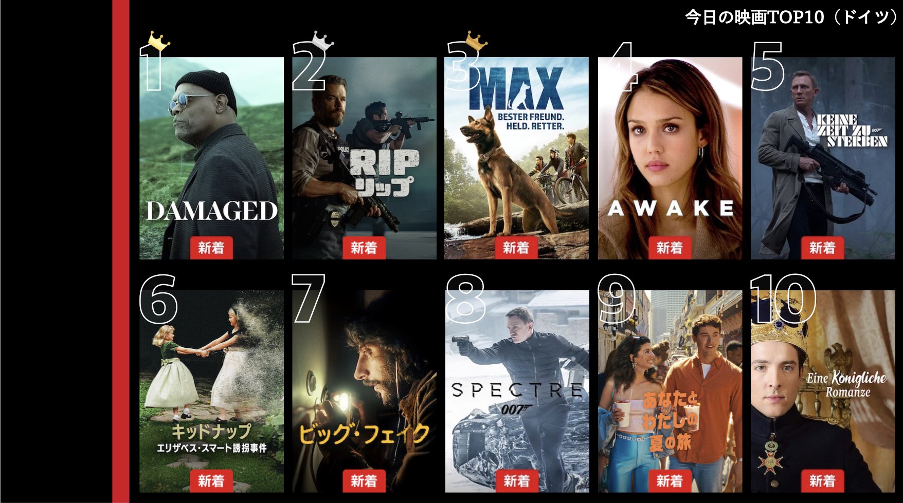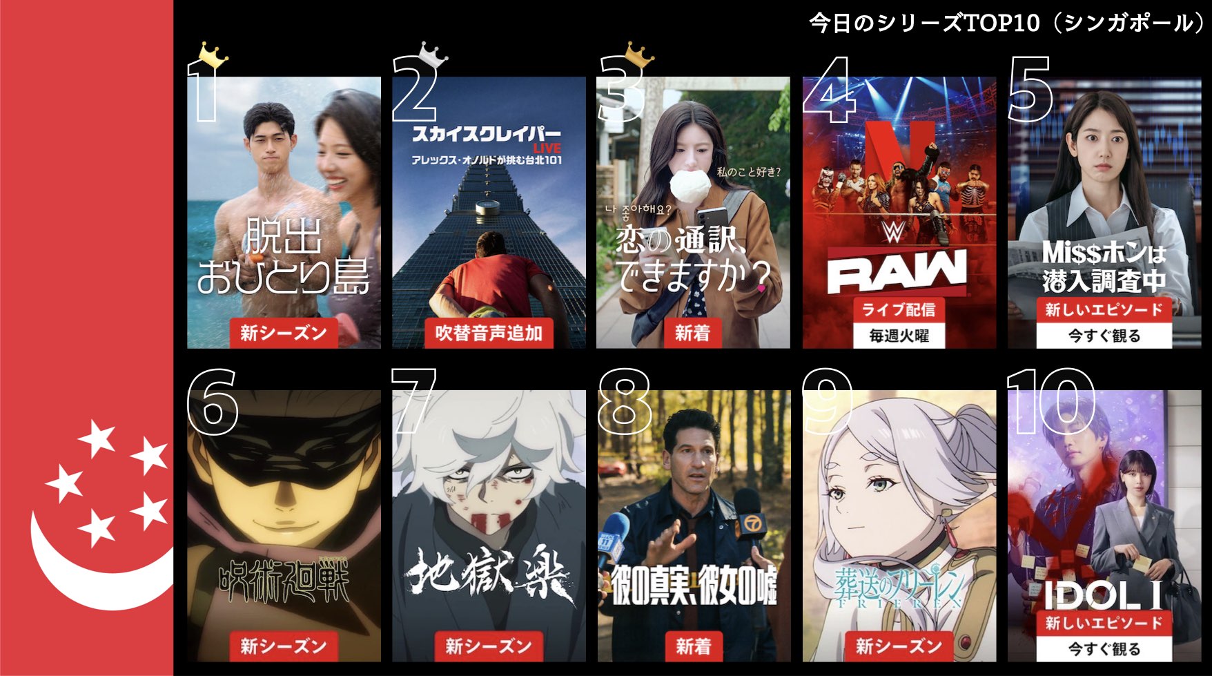 各国のNetflix (ネットフリックス) 内で公開されている「今日のTVシリーズTOP10」と「今日の映画TOP10」をもとに、世界の視聴動向を独自にまとめたランキングを毎日更新!主要国でいま、どんな作品が注目されているかチェックしてみましょう。