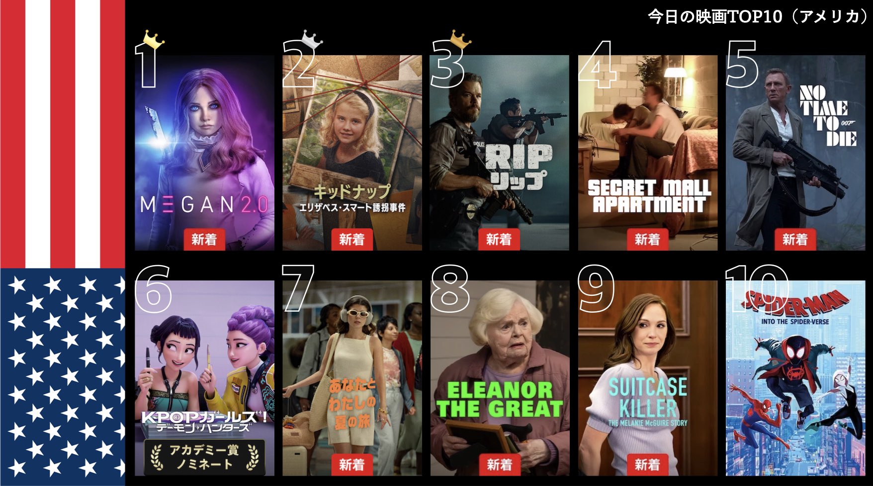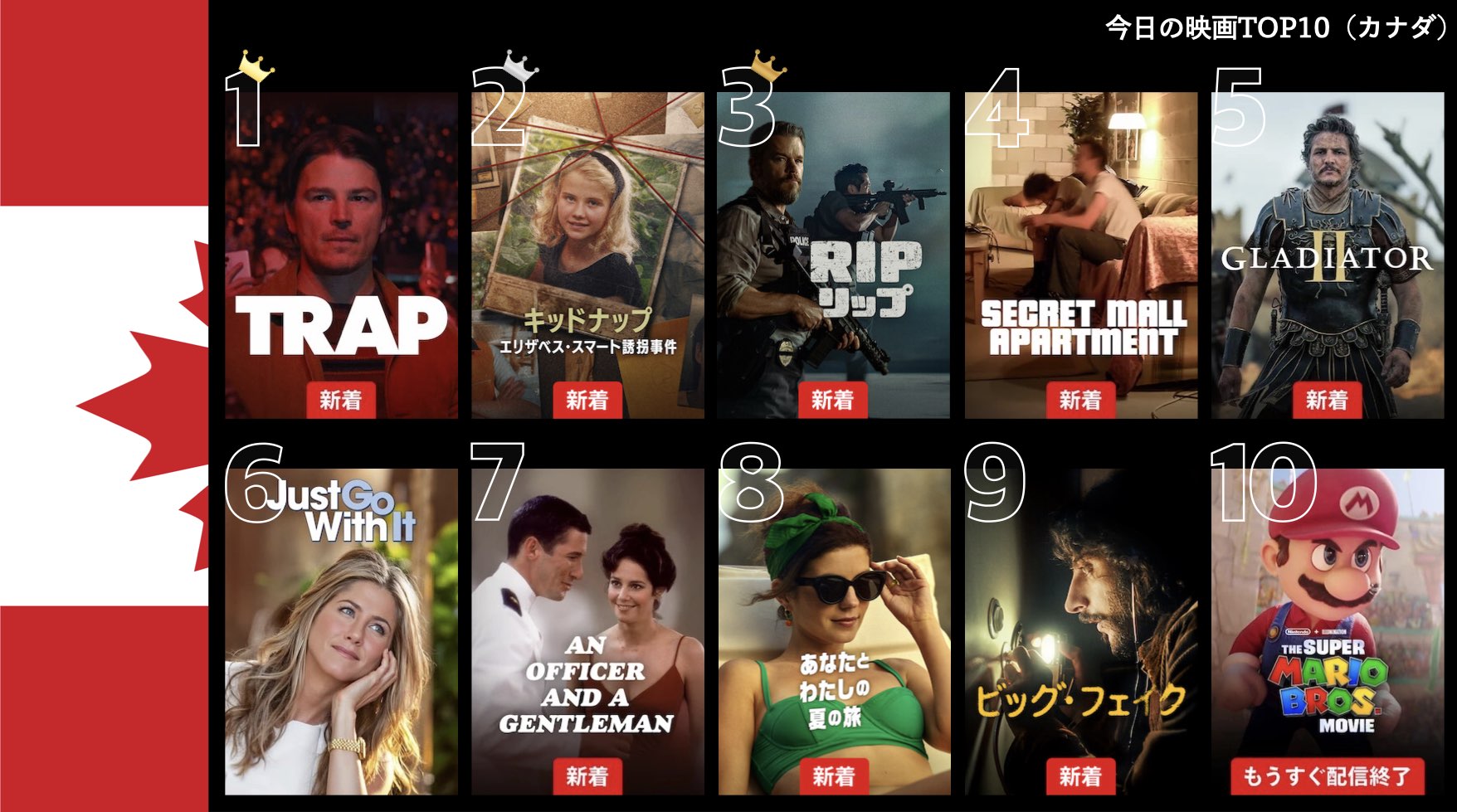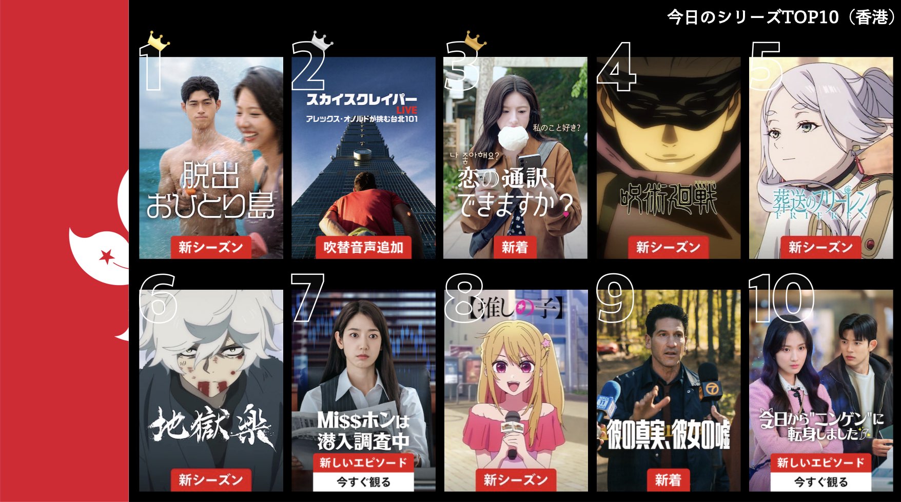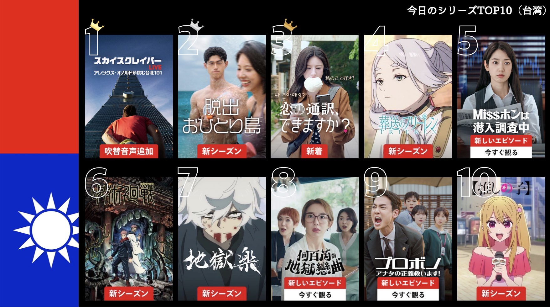 各国のNetflix (ネットフリックス) 内で公開されている「今日のTVシリーズTOP10」と「今日の映画TOP10」をもとに、世界の視聴動向を独自にまとめたランキングを毎日更新!主要国でいま、どんな作品が注目されているかチェックしてみましょう。