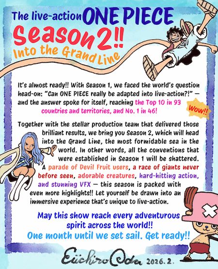 実写シリーズは前作同様、シーズン2も原作者・尾田栄一郎が深く関わっている。Netflixは予告編とあわせて、尾田からの直筆メッセージを公開。そこにはシーズン1の成功と、新章への期待が綴られている。
