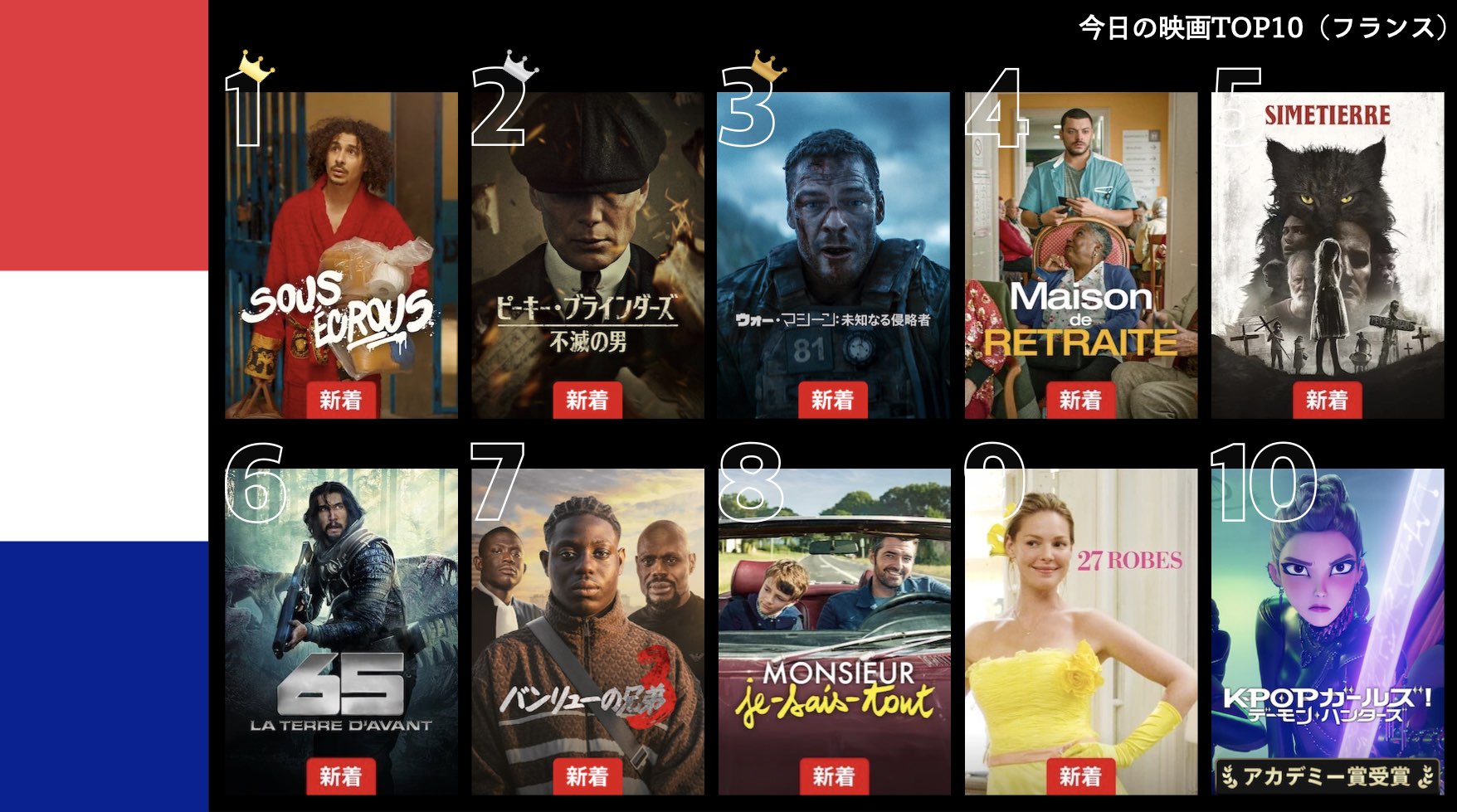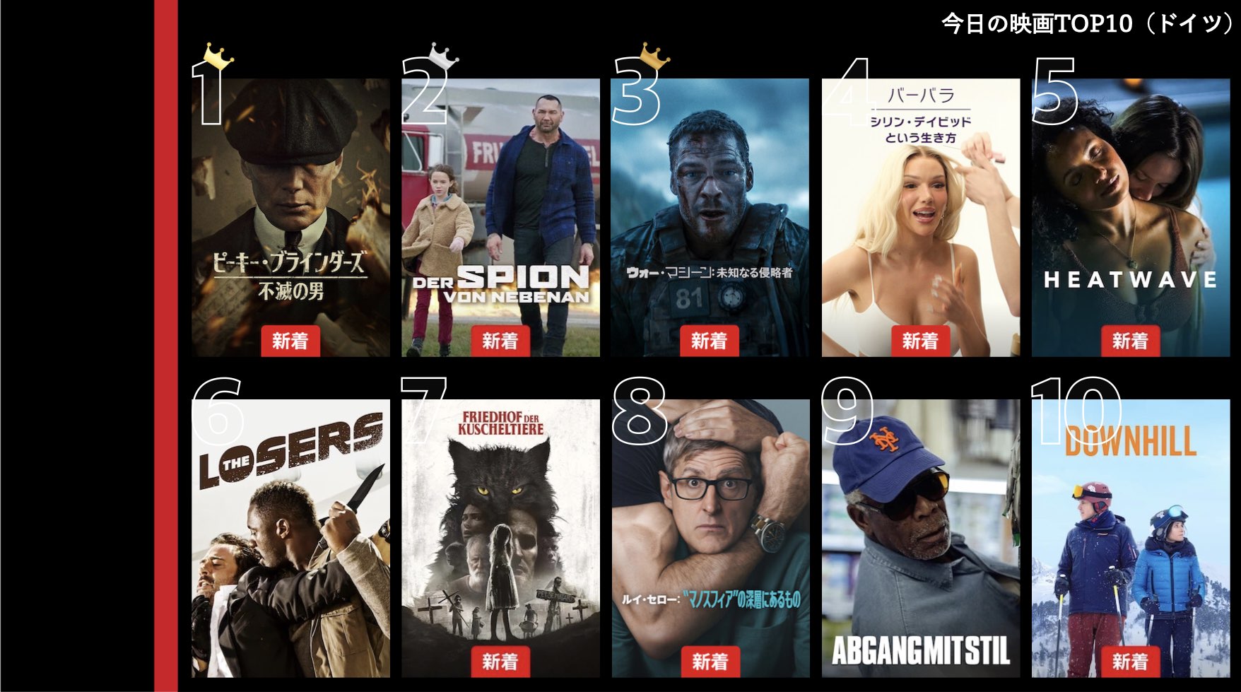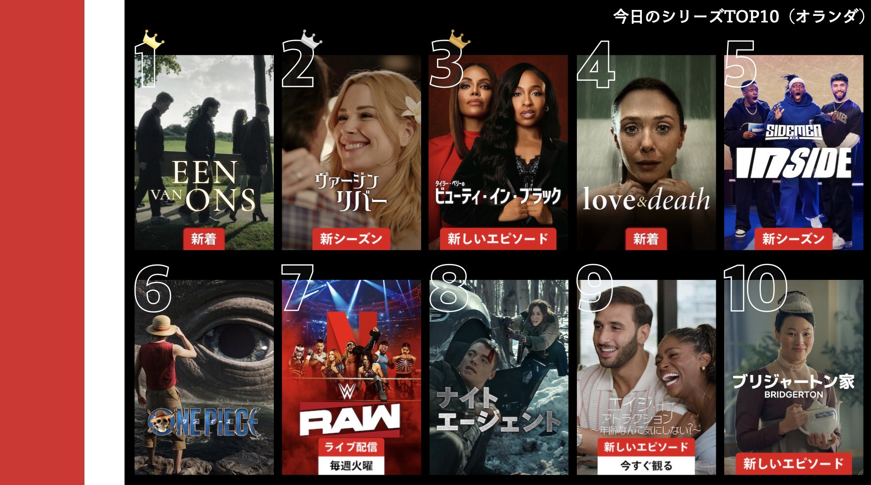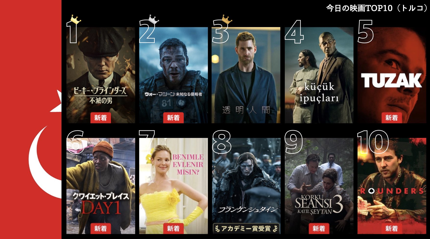各国のNetflix (ネットフリックス) 内で公開されている「今日のTVシリーズTOP10」と「今日の映画TOP10」をもとに、世界の視聴動向を独自にまとめたランキングを毎日更新!主要国でいま、どんな作品が注目されているかチェックしてみましょう。