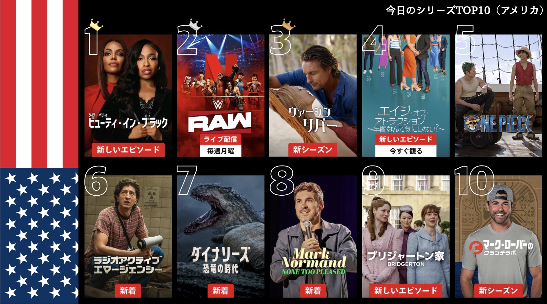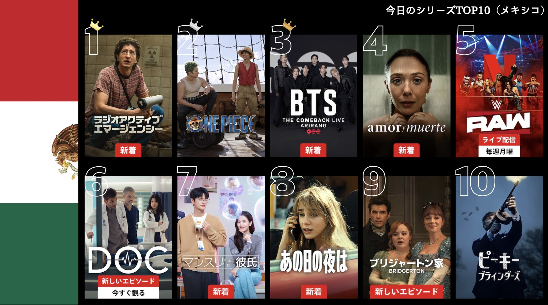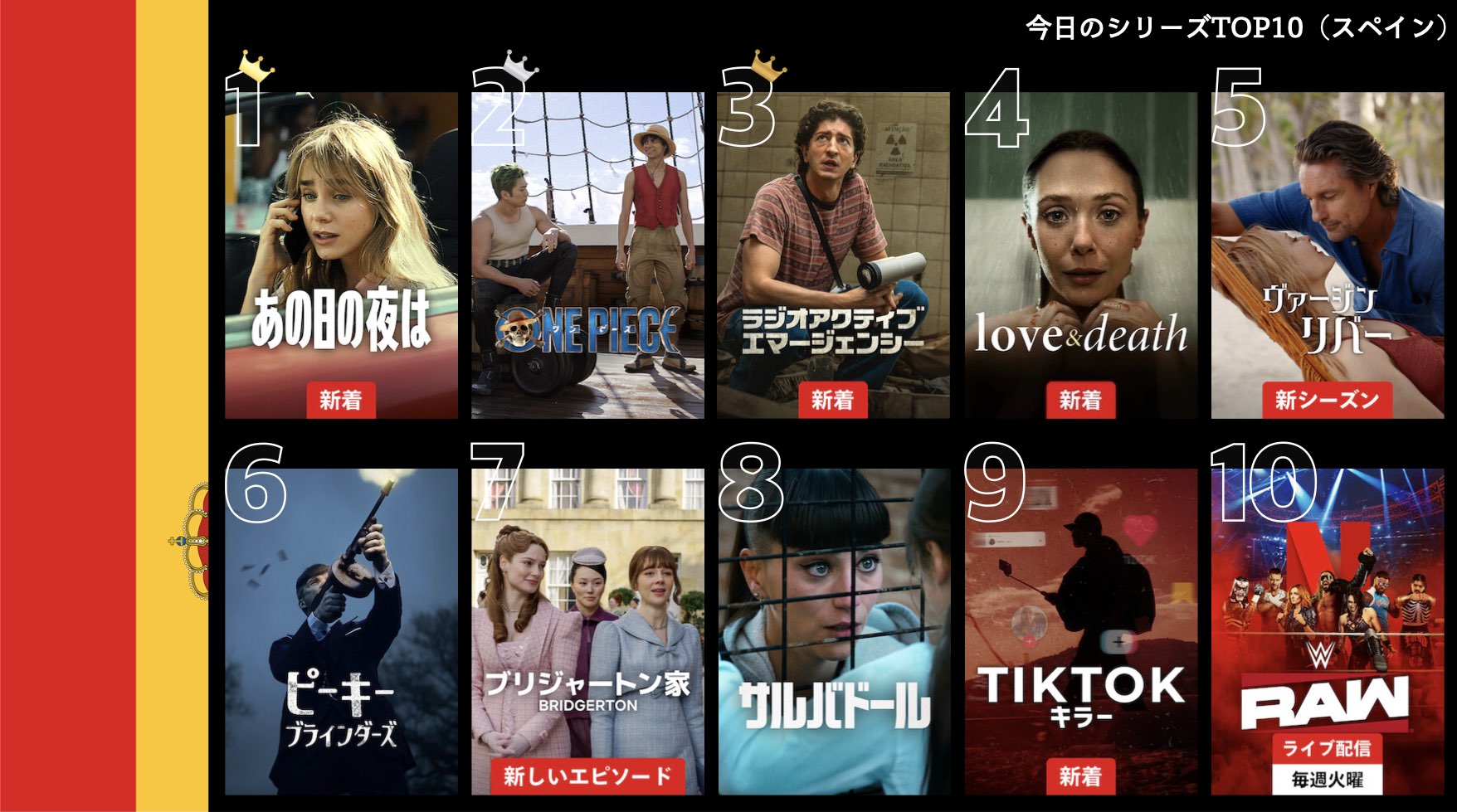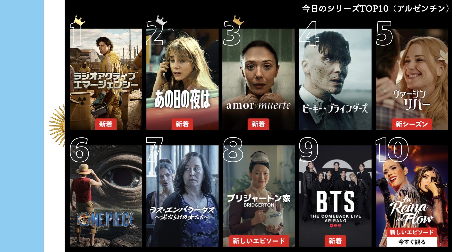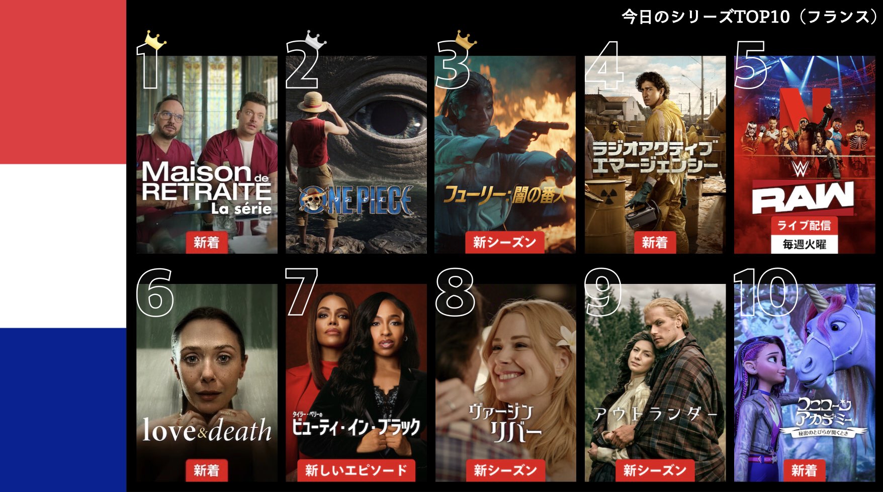 各国のNetflix (ネットフリックス) 内で公開されている「今日のTVシリーズTOP10」と「今日の映画TOP10」をもとに、世界の視聴動向を独自にまとめたランキングを毎日更新!主要国でいま、どんな作品が注目されているかチェックしてみましょう。