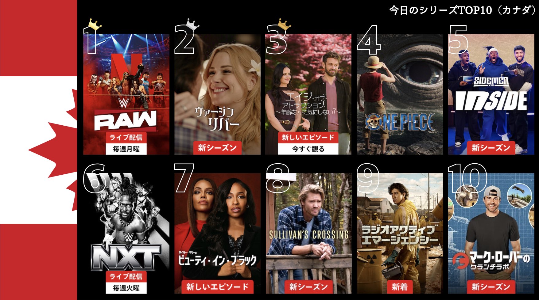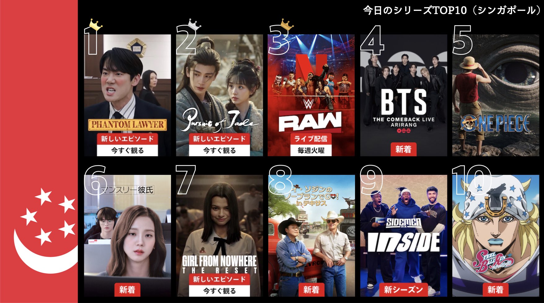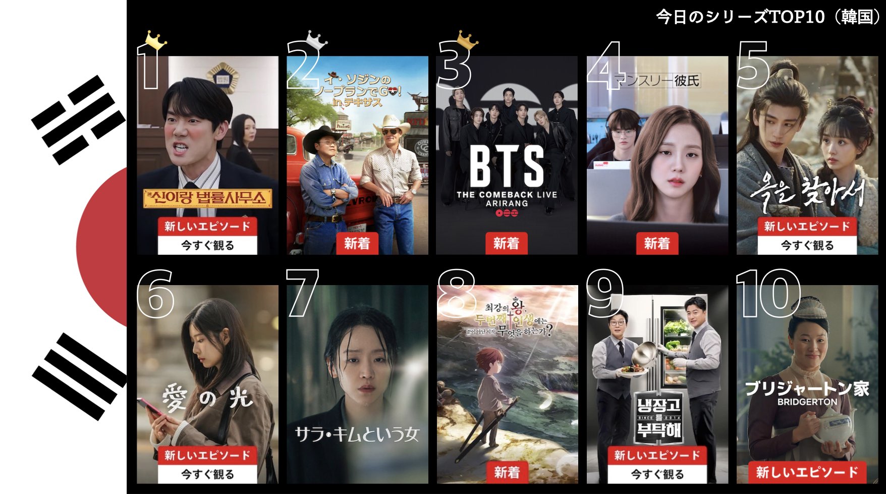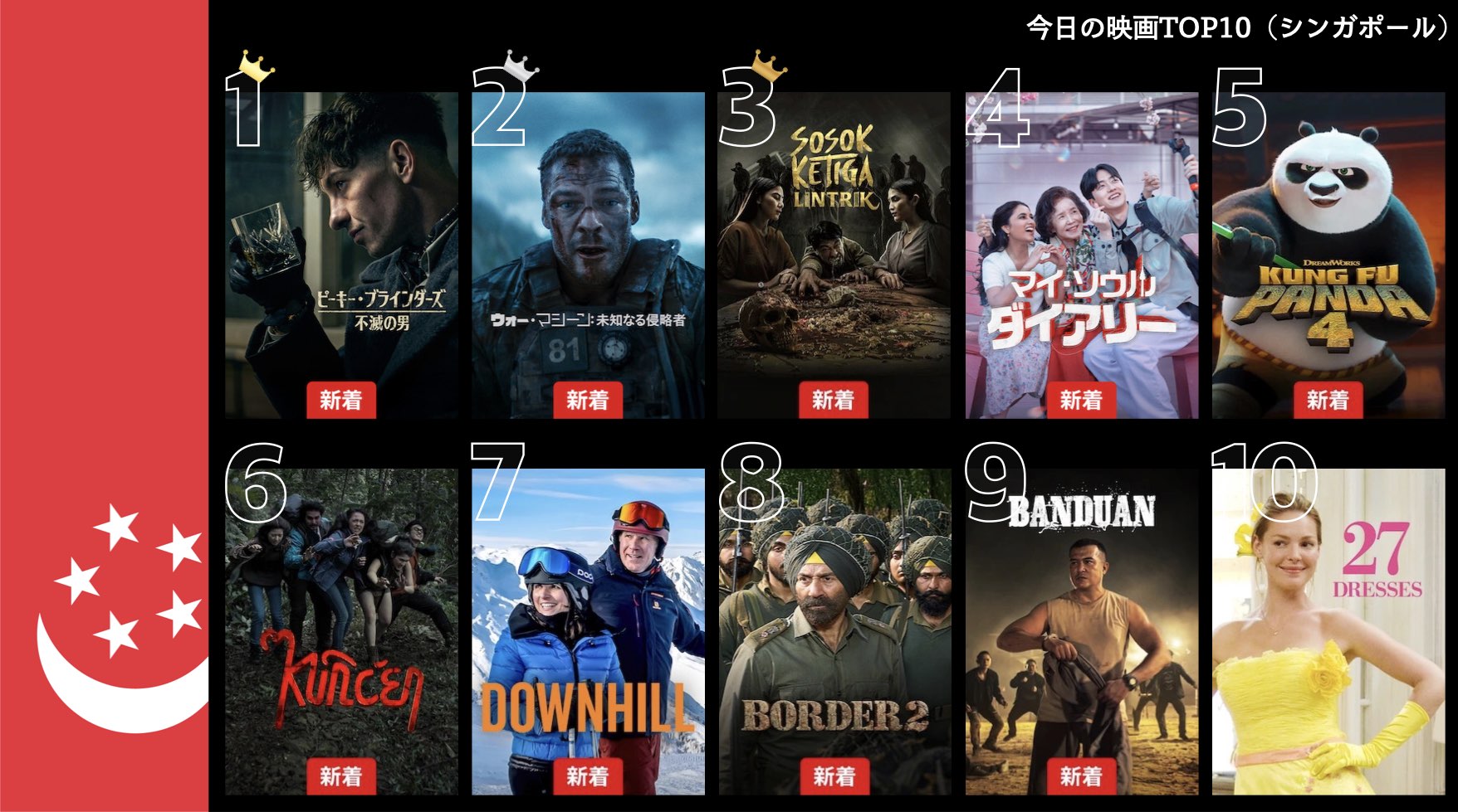 各国のNetflix (ネットフリックス) 内で公開されている「今日のTVシリーズTOP10」と「今日の映画TOP10」をもとに、世界の視聴動向を独自にまとめたランキングを毎日更新!主要国でいま、どんな作品が注目されているかチェックしてみましょう。