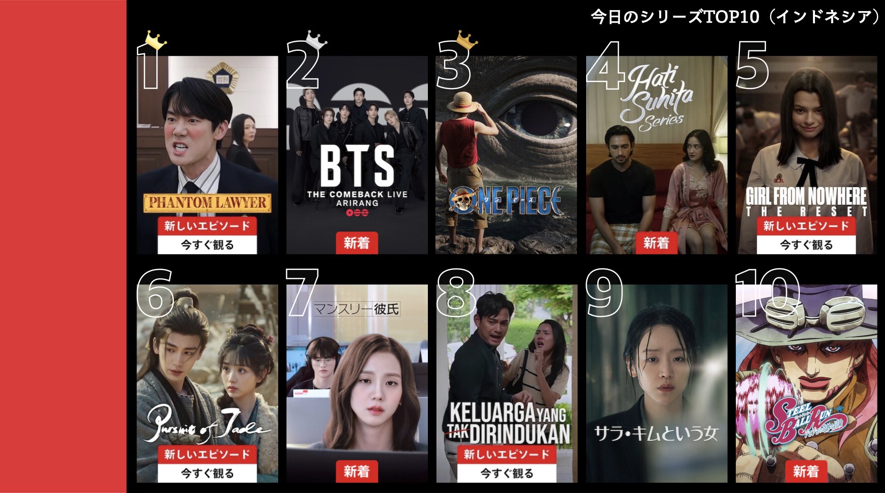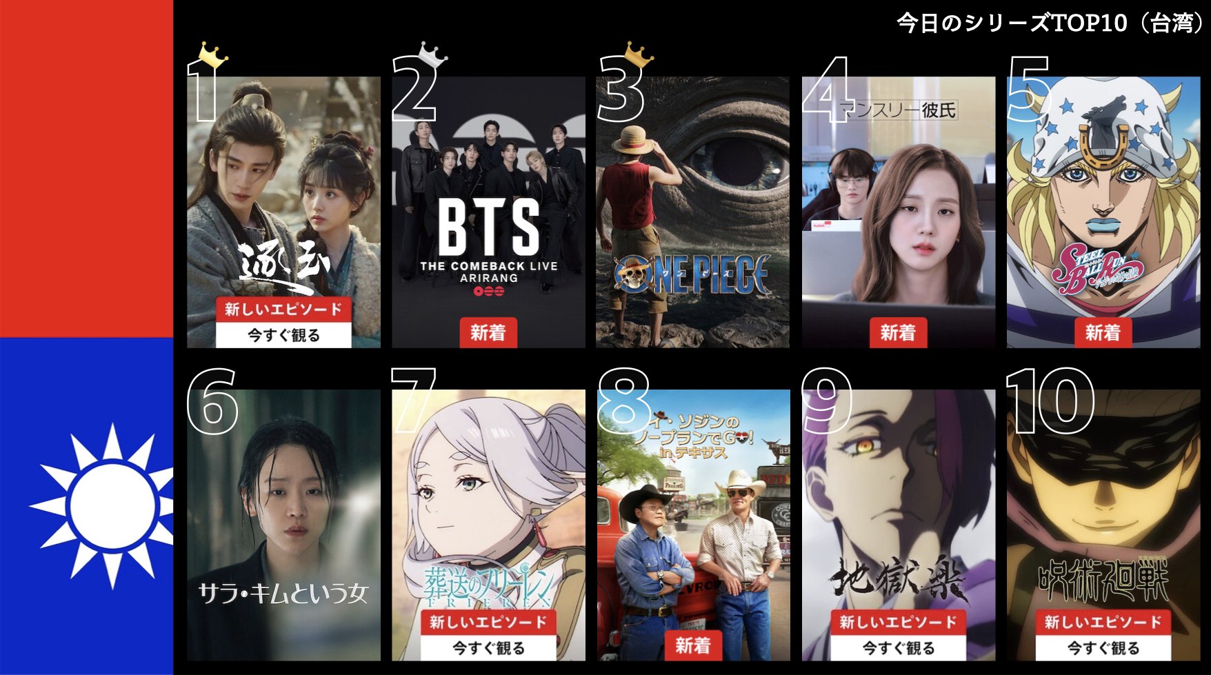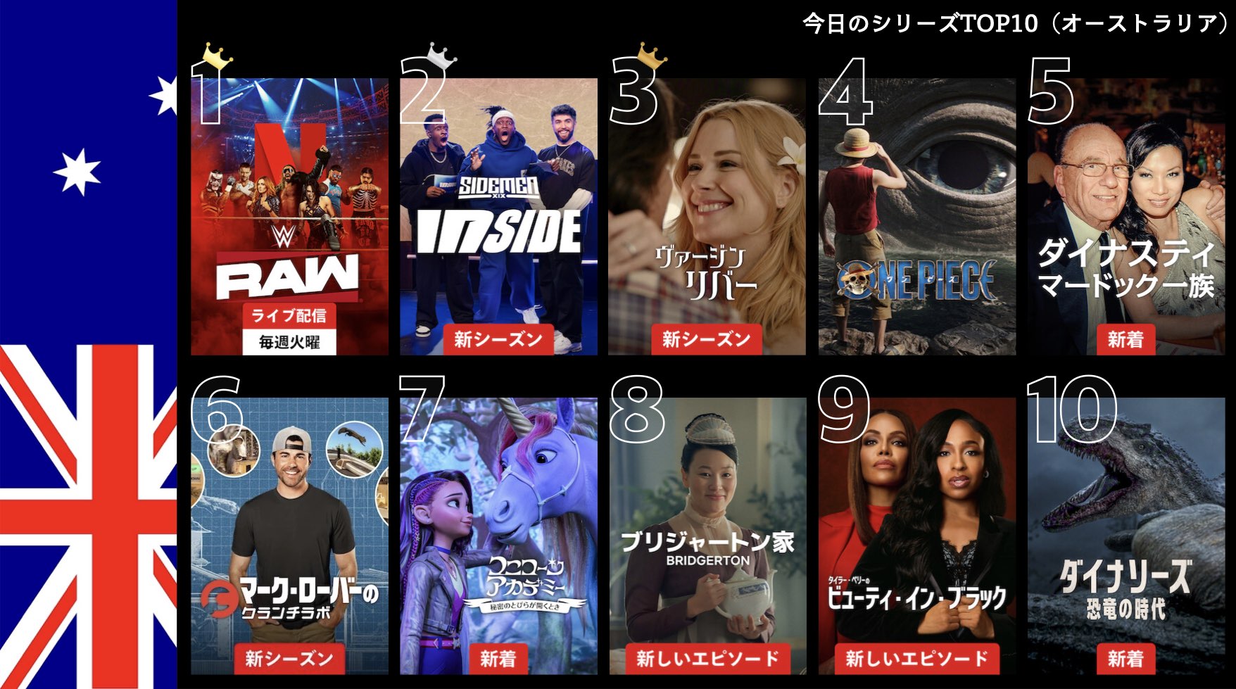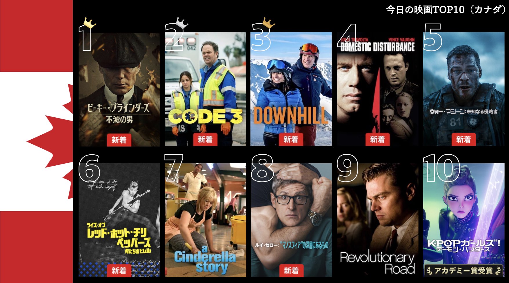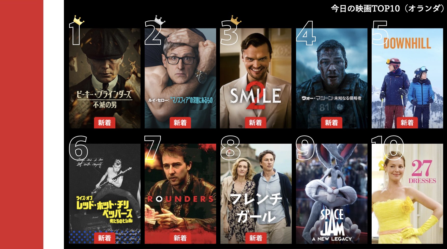 各国のNetflix (ネットフリックス) 内で公開されている「今日のTVシリーズTOP10」と「今日の映画TOP10」をもとに、世界の視聴動向を独自にまとめたランキングを毎日更新!主要国でいま、どんな作品が注目されているかチェックしてみましょう。