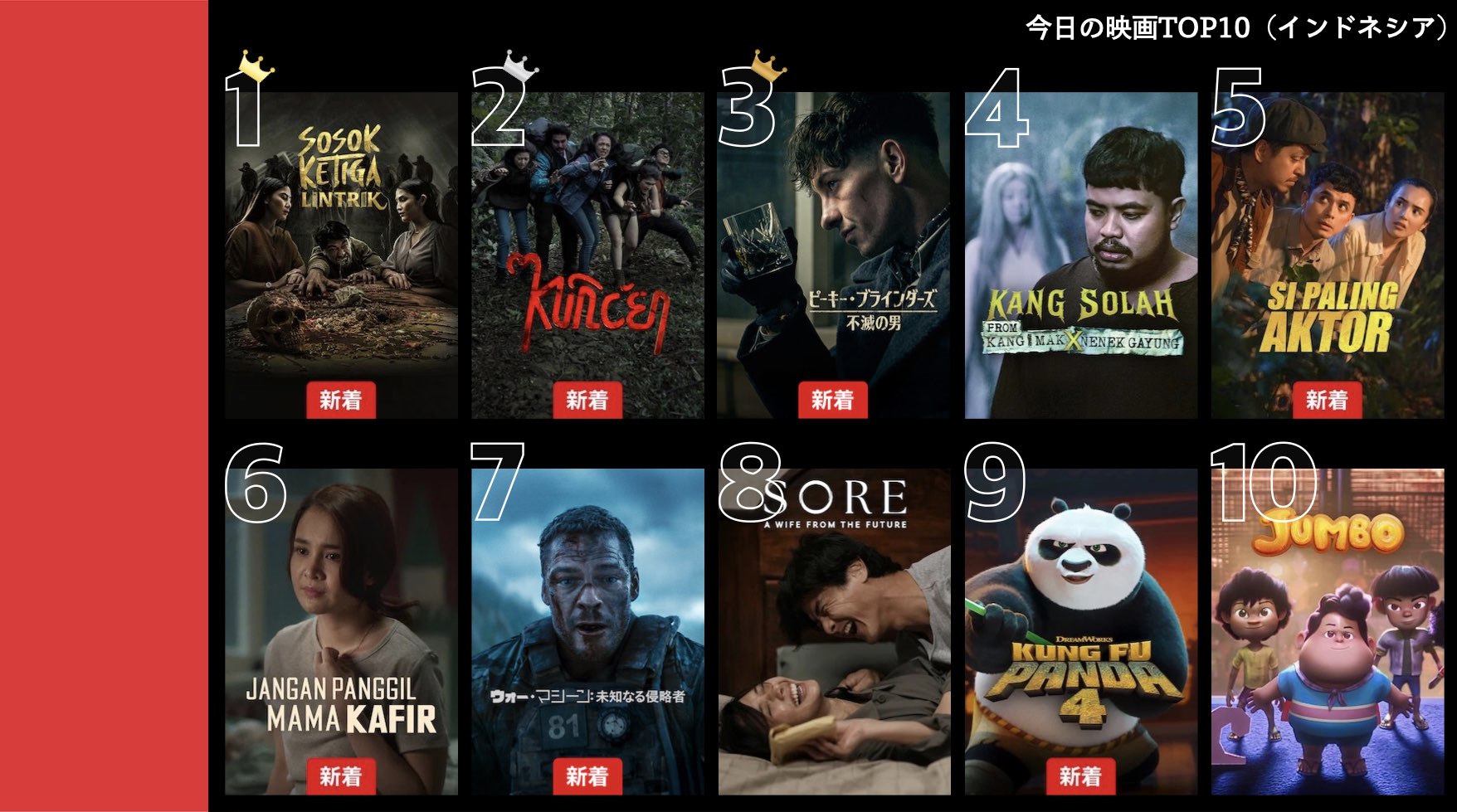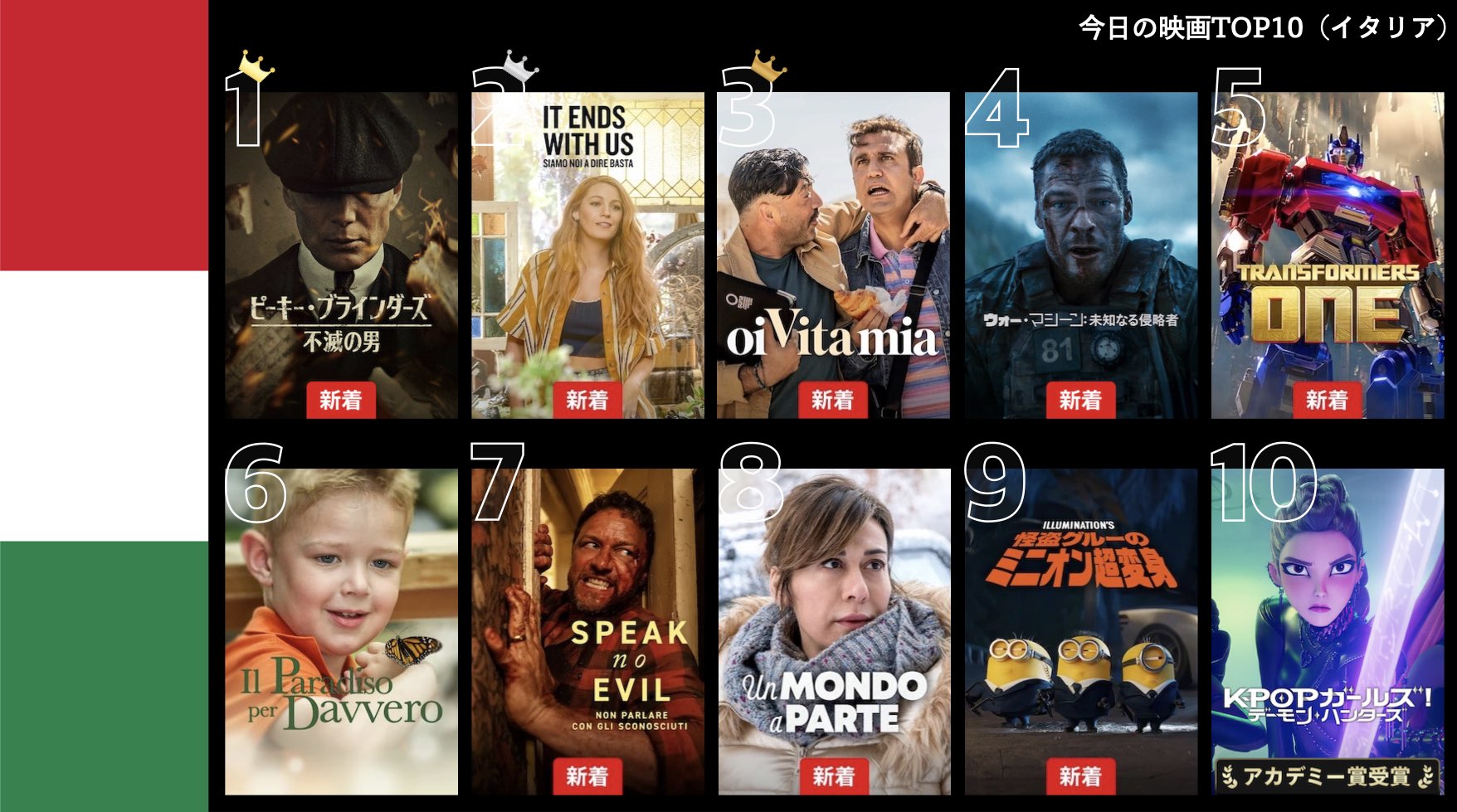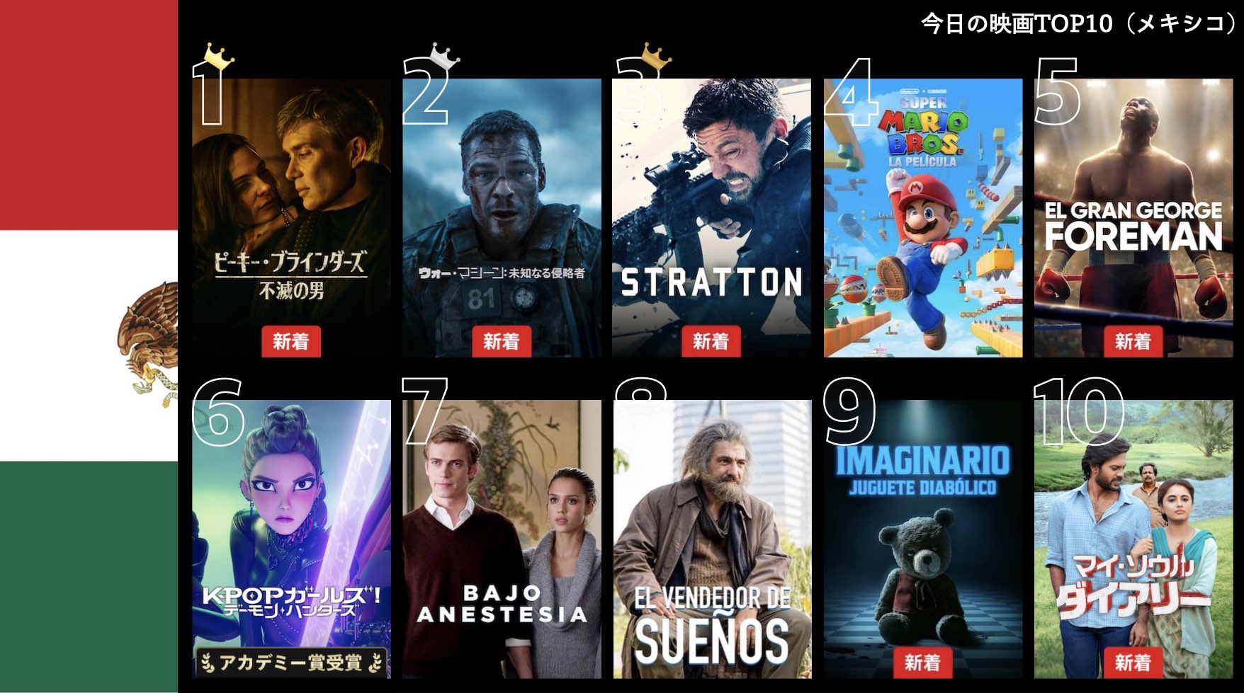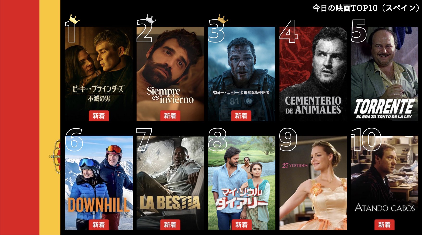 各国のNetflix (ネットフリックス) 内で公開されている「今日のTVシリーズTOP10」と「今日の映画TOP10」をもとに、世界の視聴動向を独自にまとめたランキングを毎日更新!主要国でいま、どんな作品が注目されているかチェックしてみましょう。
